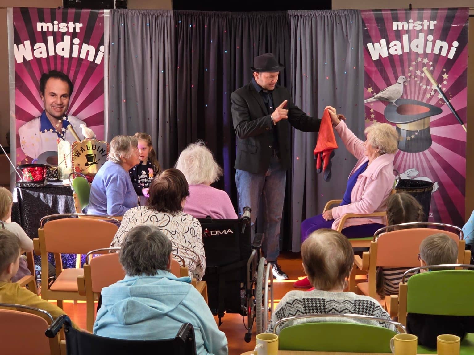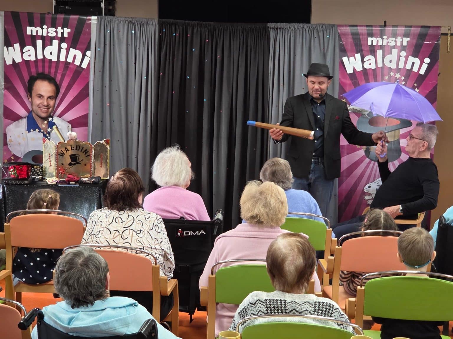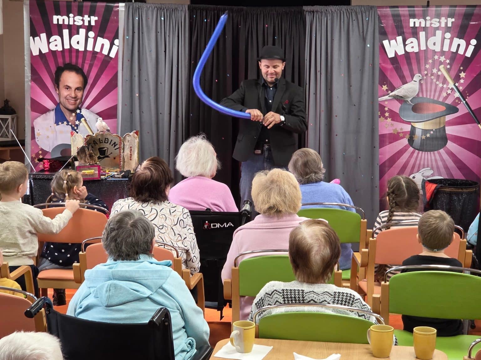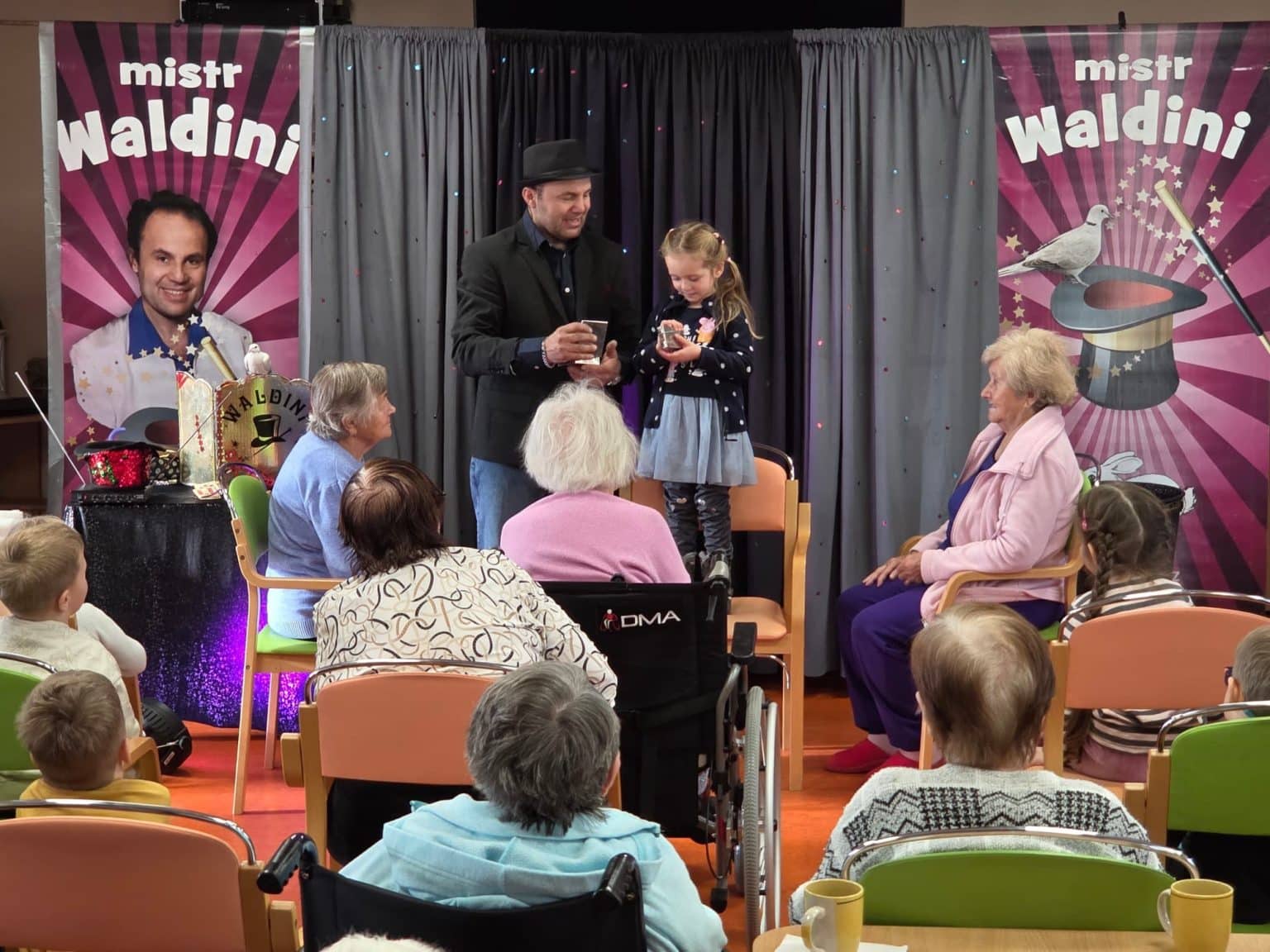 Minulý týden jsme zažili dojemné a veselé dopoledne. Opět k nám totiž zavítaly děti z MŠ Střední novosadská. A tentokrát jsme na toto mezigenerační setkání pozvali i pana kouzelníka „Waldiniho“, který vykouzlil úsměvy a překvapení na tvářích dětí i našich klientů.