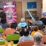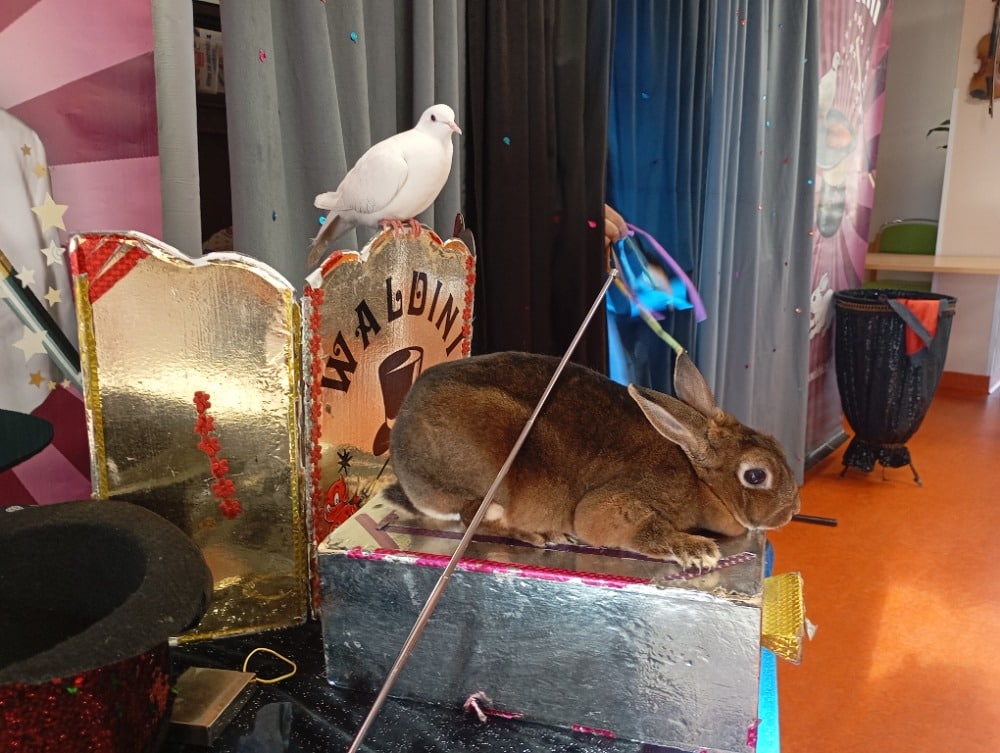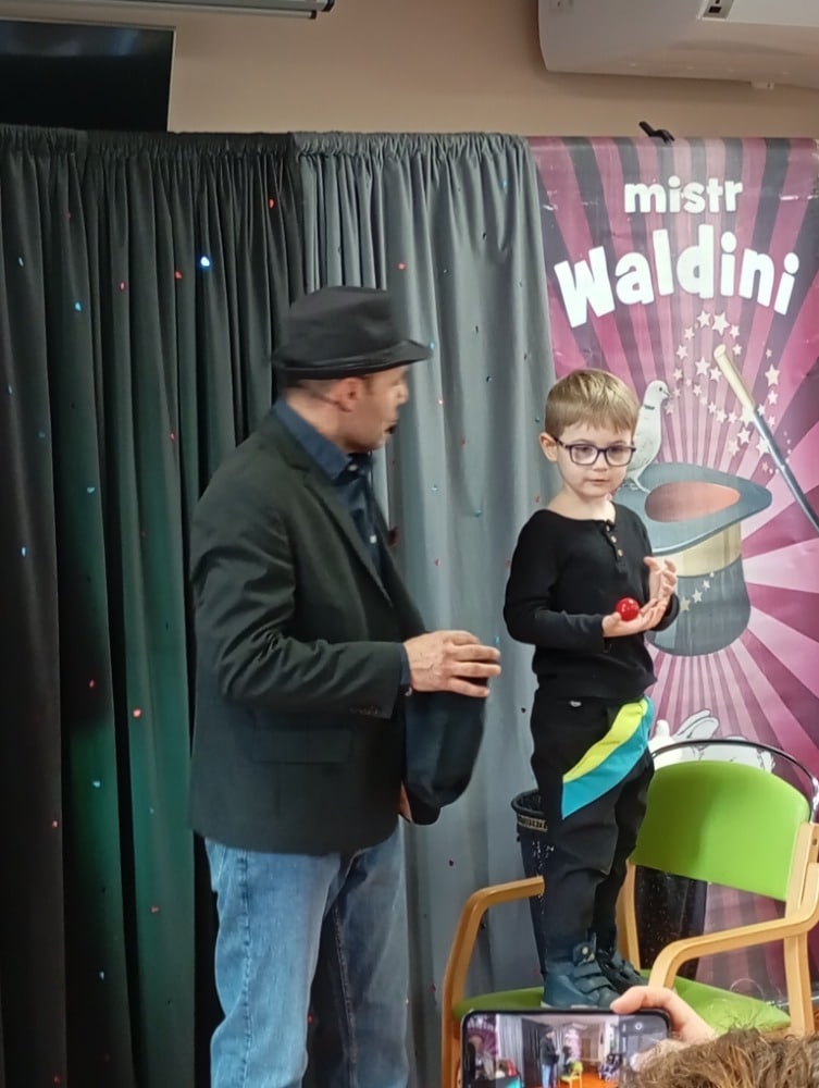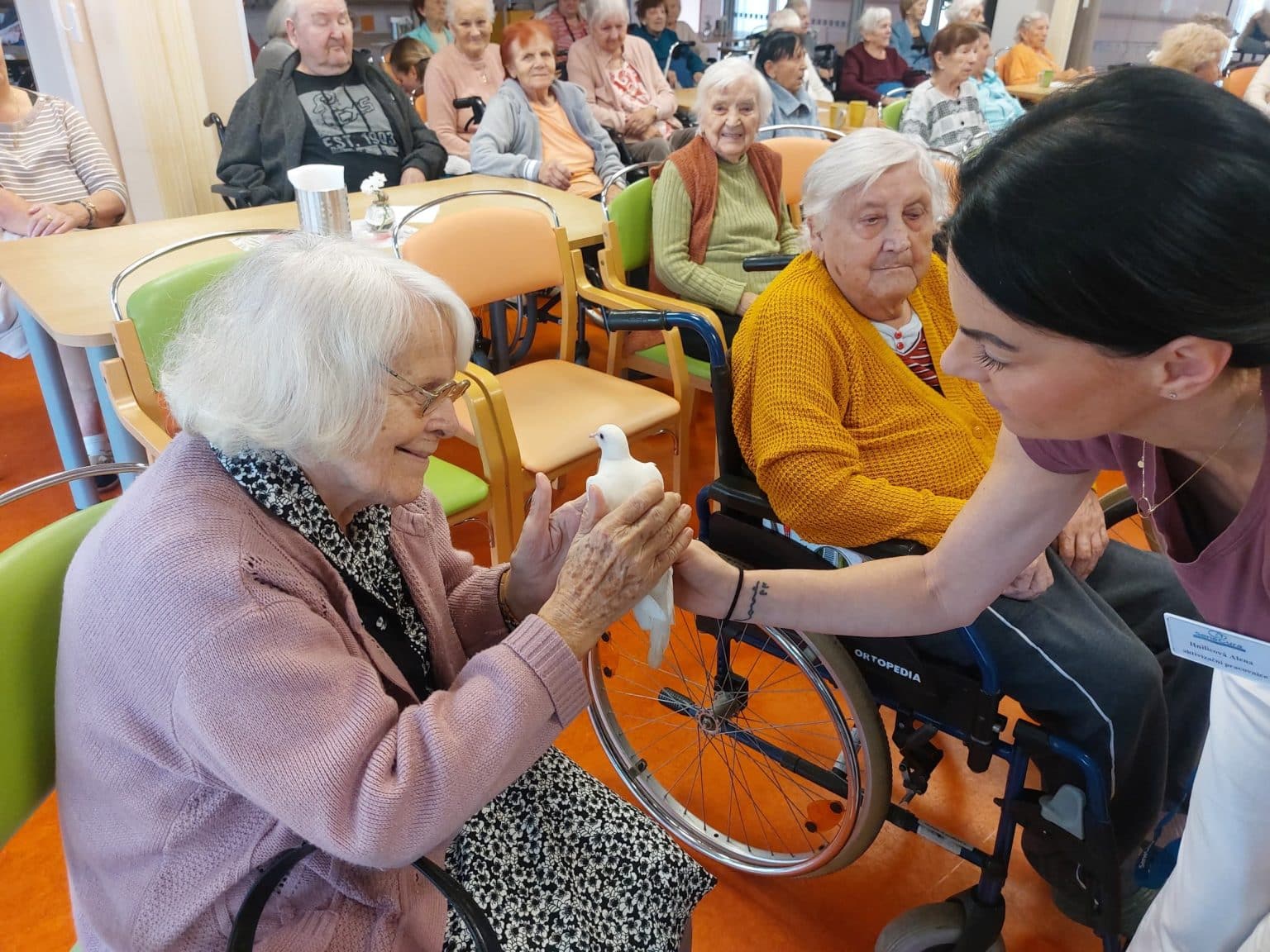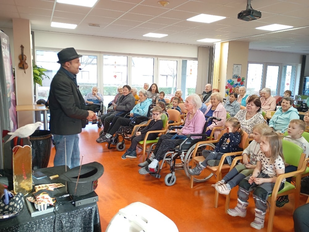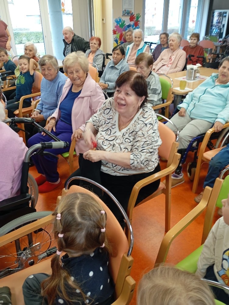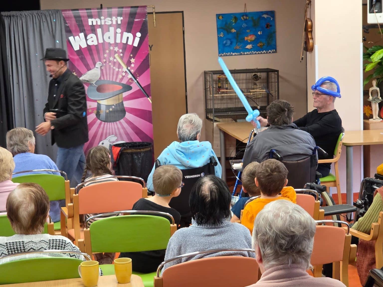 Minulý týden jsme zažili dojemné a veselé dopoledne. Opět k nám totiž zavítaly děti z MŠ Střední novosadská. A tentokrát jsme na toto mezigenerační setkání pozvali i pana kouzelníka „Waldiniho“, který vykouzlil úsměvy a překvapení na tvářích dětí i našich klientů.